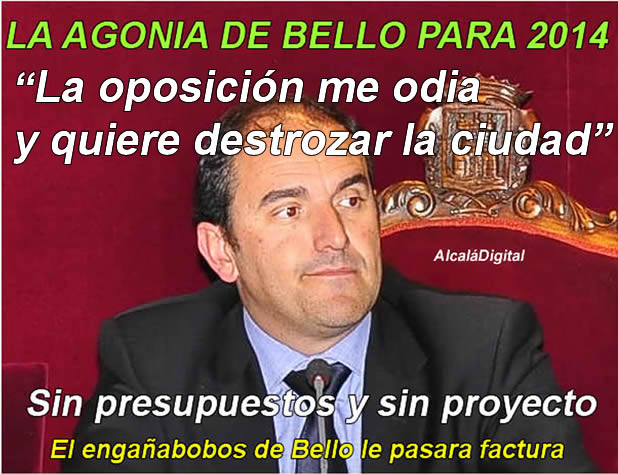 Un año de “agonía” para Bello, se comenta por los mentideros alcalaínos, en donde vera como su gran proyecto de distracción, como es la negociación del PGOU, es rechazado en la Comunidad de Madrid, por PP y PSOE, por lo que la gente del “pelotazo del ladrillo”, se verá humillada y engañada, con lo que a Bello, no le saldrá “gratis”, la venta de humo. Es más, con esta perspectiva, se duda ya que sea incluso admitido a trámite para su discusión el próximo año en la Asamblea de Madrid. ¿Pero quién se va a mojar a escasos meses de unas elecciones municipales y, con un panorama en las encuetas que confirman, una reconfiguración severa del mapa de poder en Alcalá? El engañabobos de Bello, le pasara factura en el segundo trimestre del próximo 2014, y sino, al tiempo.