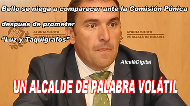 AlcaláDigital.- El alcalde popular, Javier Bello, ha vuelto a confirmar que su palabra, es tan volátil como incierta, y de poco valor, ya que prometió claridad y colaboración, para poner en marcha una comisión de investigación, sobre la red Púnica, y a escasos 35 días, se niega a comparecer ante dicha comisión, para contestar a las preguntas sobre los contratos que firmó.