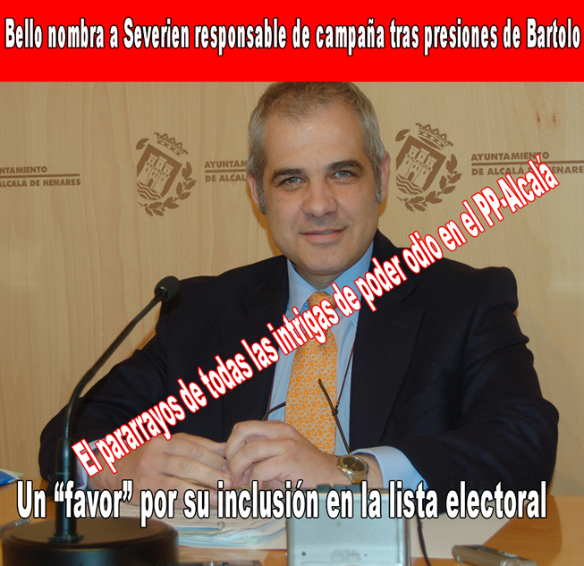 AlcaláDigital.- El nombramiento de Gustavo Severien, como coordinador de la campaña electoral de Bello, es un favor que, le tiene que agradecer, Gustavo, a Bartolo, ya que solo aceptando semejante “marrón”, se puede entender, su inclusión automática en los puestos de salida, en la próxima lista electoral que se está cocinando en la calle Génova de Madrid, y en donde al candidato a la alcaldía pepera, en Alcalá de Henares, poco o, nada le están dejando influir.